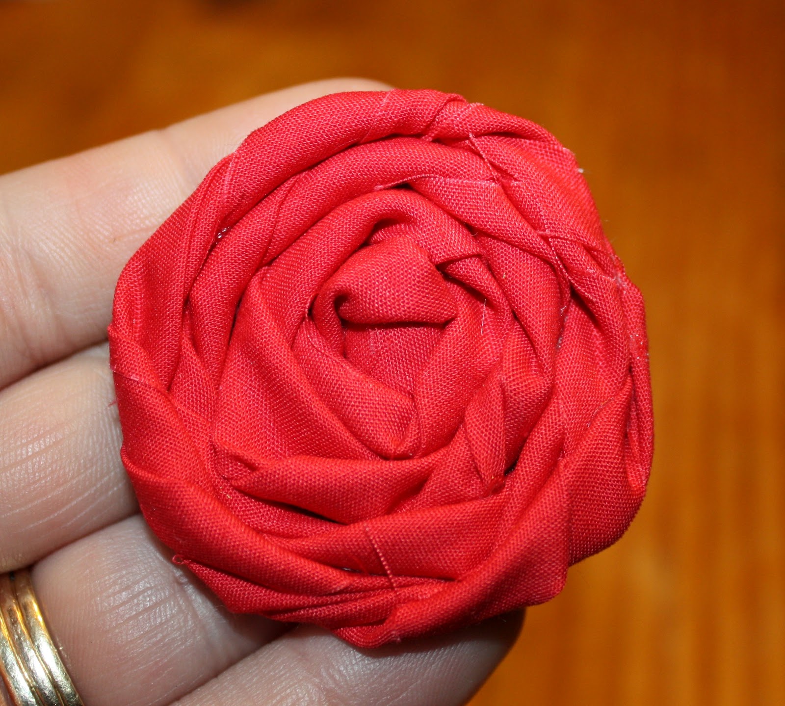To make these twisted fabric flowers you start with a small circle of felt about 1" in diameter. Cut a 22" strip of fabric and tie a knot in one end. Using a hot glue gun, glue the knot in the middle of the felt circle. Then twist the strip of fabric and wrap it around the knot gluing occasionally. Fold the last little bit of fabric over to the back and glue it down. Then add a pin back or hair clip, whichever you would like.